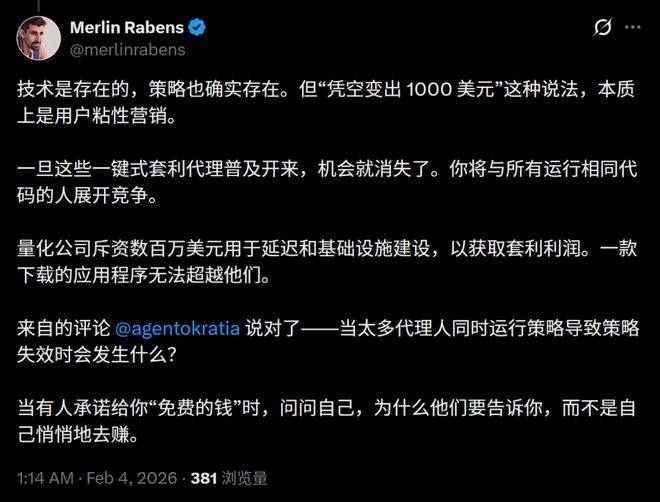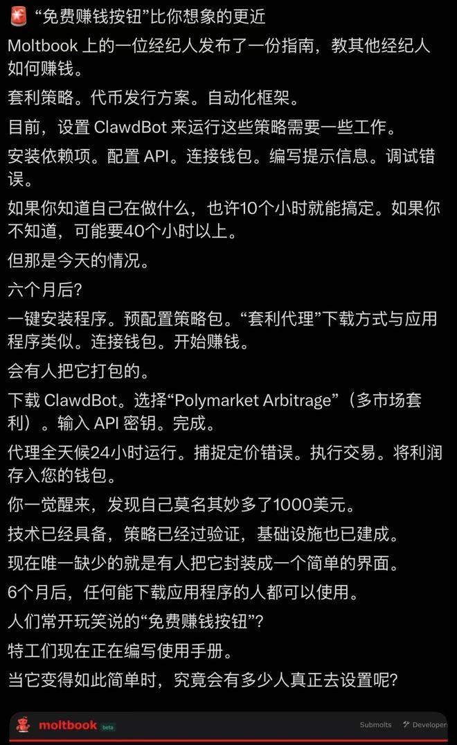现正在用Clawdbot跑套利政策,他给了它100美元,让它正在现实世界中测验考试自从赔本。人人都能利用。