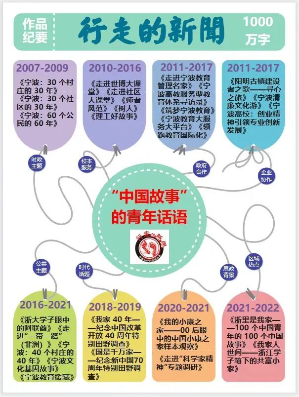 “行走的新闻”是一项与时俱进的育人工程,正式出版包括“中国故事的青年话语”系列田野调查作品24部,近5年创作“行走的新闻”之“家”系列田野调查作品5部。“行走的新闻”品牌获得过教育部校园文化一等奖,教育部新闻传播教指委创新奖,浙江省教学成果一等奖。