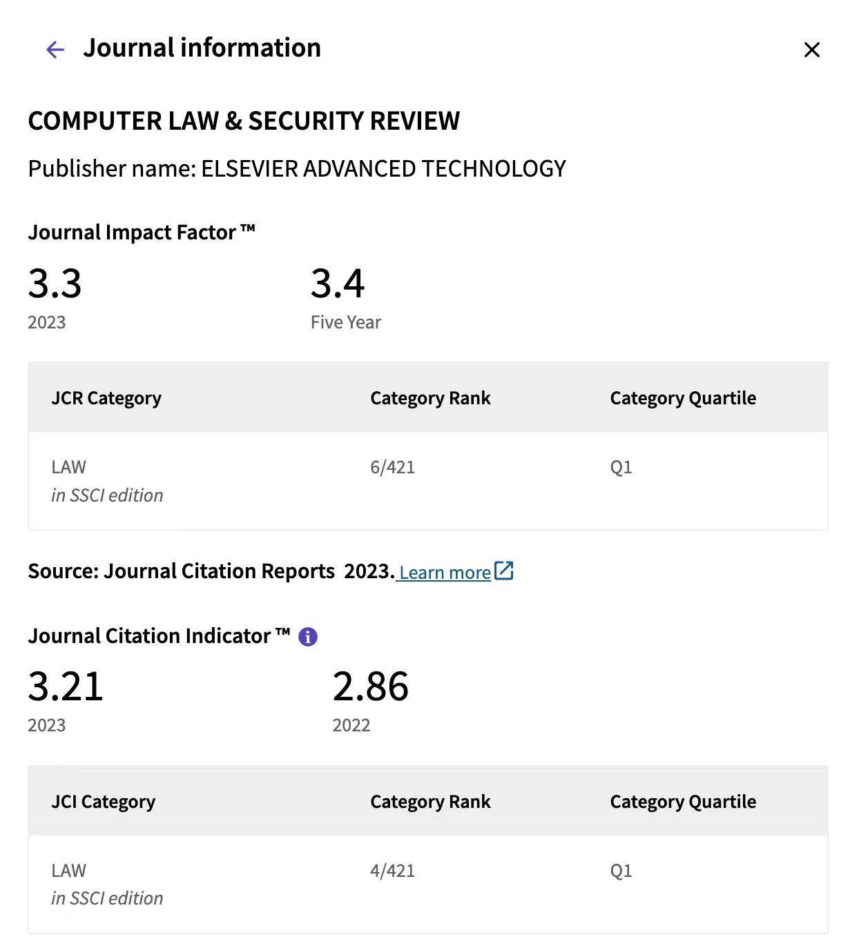 2024年10月,我院李凯更博士、吴泓副教授、董玉鹏教授在国际学术期刊《Computer Law & Security Review》上发表了题为《Copyright protection during the training stage of generative AI: Industry-oriented U.S. law, rights-oriented EU law, and fair remuneration rights for generative AI training under the UN’s international governance regime for AI》的论文。该期刊属于SSCI法学类一区期刊,并在421个SSCI法学期刊中排名第6(JCR分区排名)。
