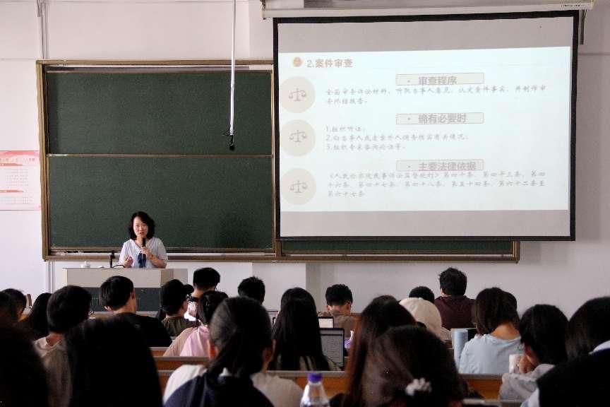 讲座伊始,励倩主任用最高检指导性案例导入本次主题,向同学们阐述了民事检察的定义及其三大特点,指出民事检察不仅可以保护当事人权益、提高司法效率,还能有效促进法律统一正确实施、增强司法公信力,强调了民事检察的重要性。