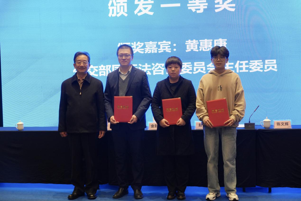 在大会主旨报告环节,外交部国际法咨询委员会主任委员、我校省级涉外法治人才协同培养创新基地首席专家黄惠康教授作《一体推进涉外法治体系和能力建设的实践路径》主旨报告。在会议论文评选环节,我校李凯更、李敬昌、韩小梅老师分别荣获会议论文一、二、三等奖。在专题论坛环节,新当选副会长的董玉鹏教授作为评议专家对《大型数字平台跨境监管合作与国家间协调机制研究》一文进行评议,李凯更老师作《浙江省国际化营商环境建设中的法律风险防范与对策研究》专题发言,李敬昌老师作《我国商事调解制度之调解选择意思自治》专题发言。