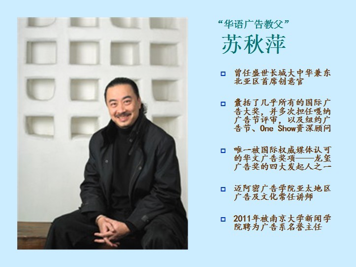 曾任盛世长城大中华兼东北亚区首席创意官。囊括了几乎所有的国际广告大奖,并多次担任嘎纳广告节评审,以及纽约广告节、One Show资深顾问,也还是唯一被国际权威媒体认可的华文广告奖项——龙玺广告奖的四大发起人之一。迈阿密广告学院亚太地区广告及文化常任讲师,2011年被南京大学新闻学院聘为广告系名誉主任。