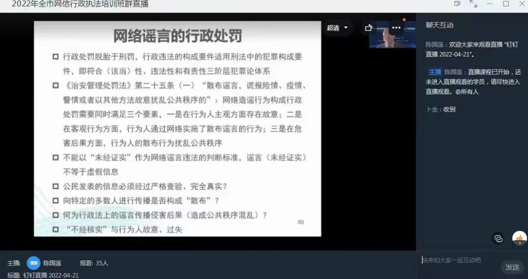 除了积极建言献策,张文祥教授于4月下旬受邀为杭州市网信系统网络执法人员做了一场有关“网络综合治理体系与信息内容治理重要问题”的线上授课,主讲内容包括网络综合治理体系建设与网络内容治理、2022年“清朗”专项行动与网络谣言治理、网络执法与网络举报制度、网络文明与网络素养等方面,努力为网络治理和数字化转型贡献智慧力量。