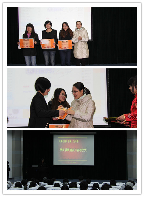 2011年12月11日晚,传媒与设计学院、法律系在NF103举行了2011-2012学年优良学风月启动仪式。参加启动仪式有传媒与法律党总支副书记朱小红、法律系主任助理王骏老以及辅导员任凯、李晓以及赵红等老师。