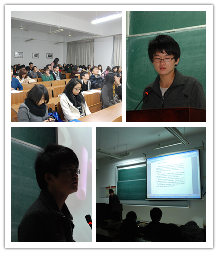 讲座正式开始,毕业于我校新闻专业,现任职于东南商报教育周刊的薛从川为大家带来了精彩的讲座。薛从川认为标题是新闻稿的灵魂,一个好的新闻标题既要能够高度概括文章内容,又要能够尽量的新奇,能够抓住读者的眼球,勾起读者的阅读兴趣!比如说上次他自己一篇新闻稿的标题为《全世界都来说中国话》,既新奇耀眼,又高度概括。确实让我们受益匪浅!他还认为:真实是新闻的生命,不真实的新闻是毫无意义的。通常他会采取问卷调查的形式来得出正确的结论。他建议同学们能够在学校里多采新闻,锻炼自己的能力。学长认为:作为一名合格的新闻人,我们的立场应该尽量的客观现实,不能掺入自己的感情色彩,对虚假现象提出质疑,这才符合新闻人的责任。