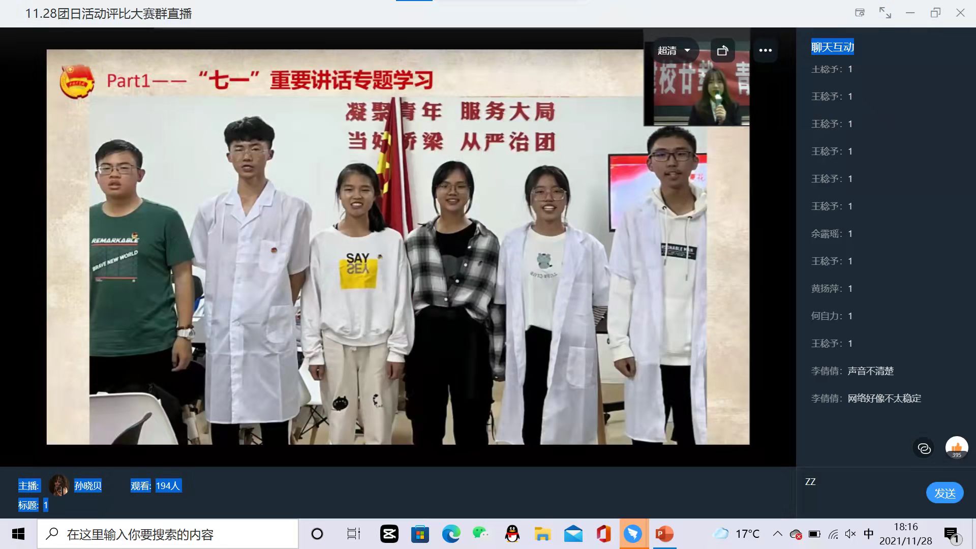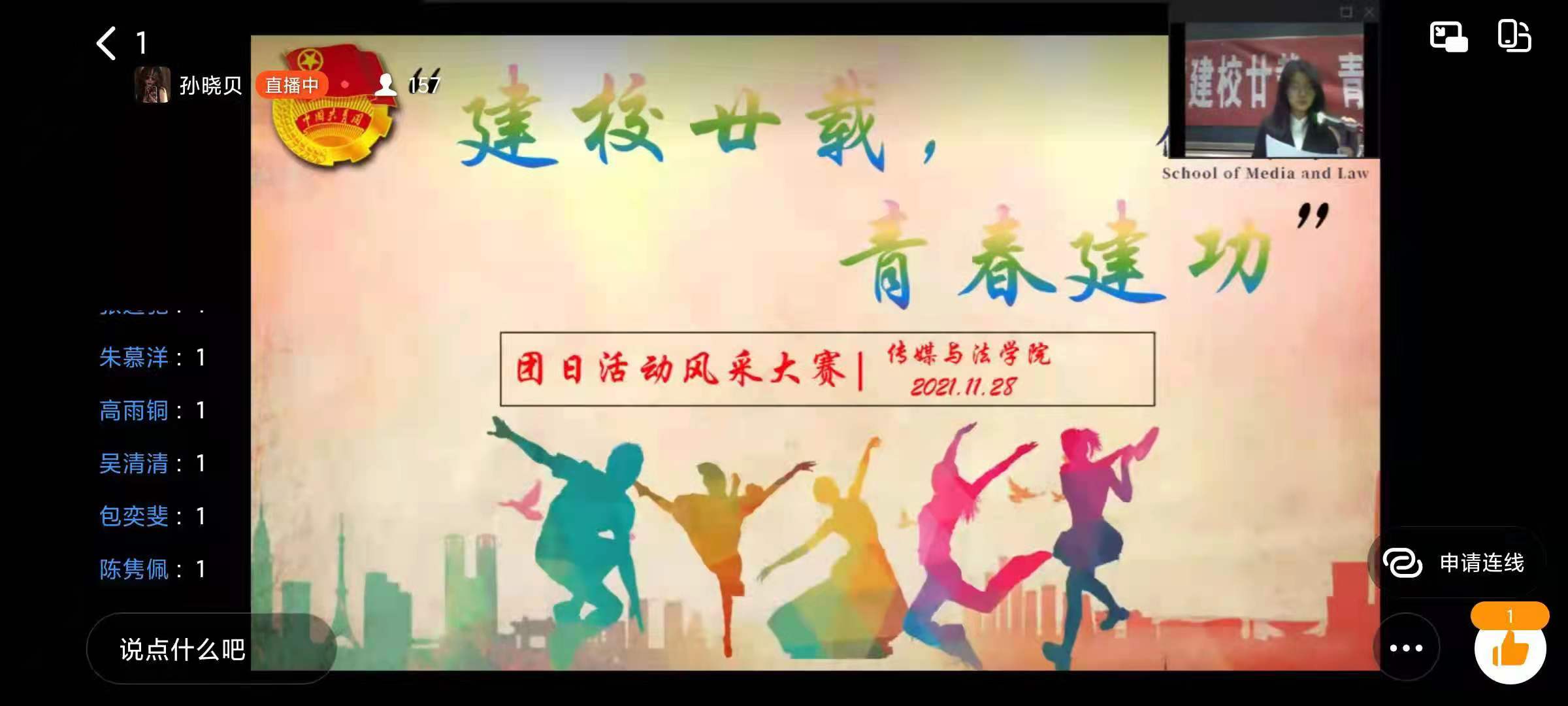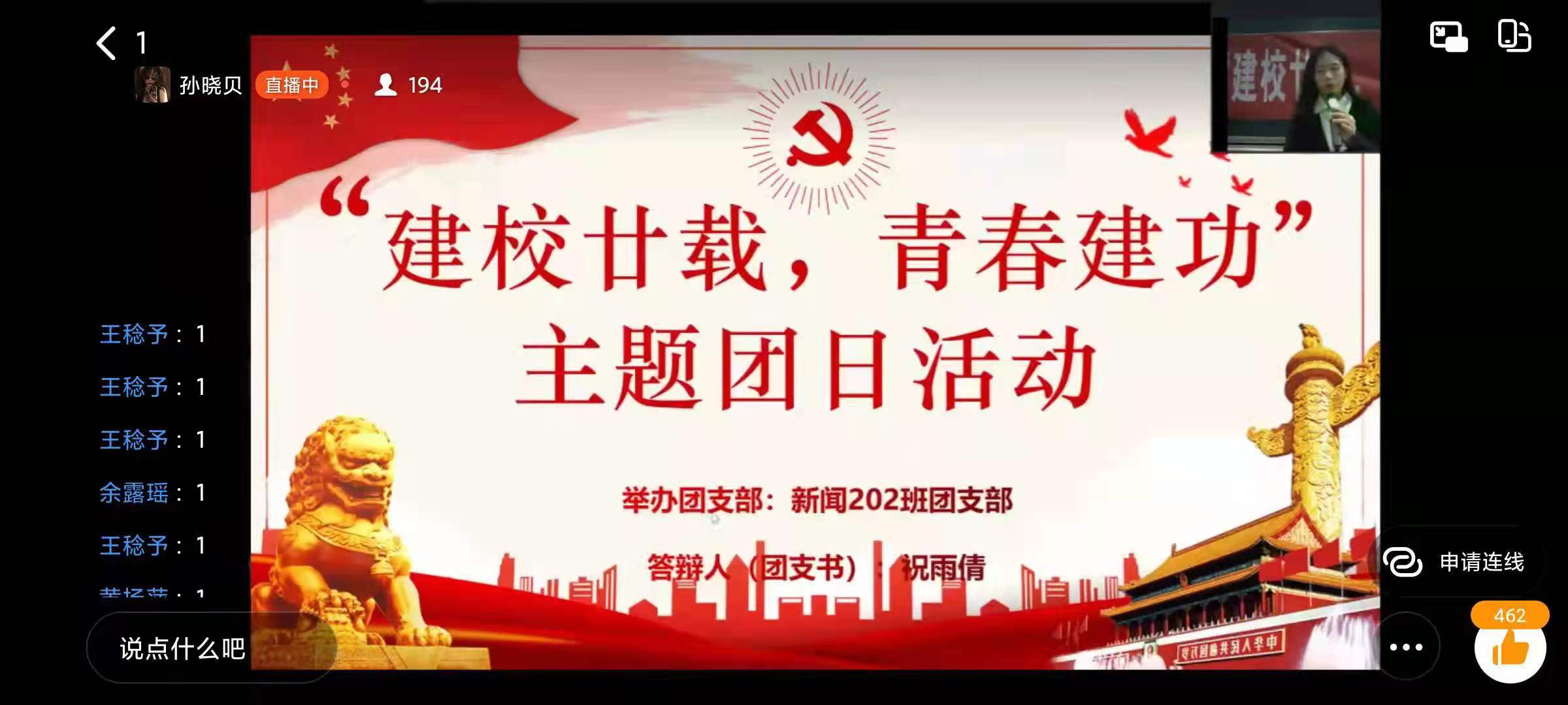 11月28日晚18:00,77779193永利集团团委线上举办“建校廿载,青春建功”主题团日活动评比大赛。学院团委书记李倩倩,学院团委、学生会主席团代表及设计学院团委副书记林天佑同学参加活动并担任评委观看此次风采大赛,此次活动由网新212班的褚静涵主持。