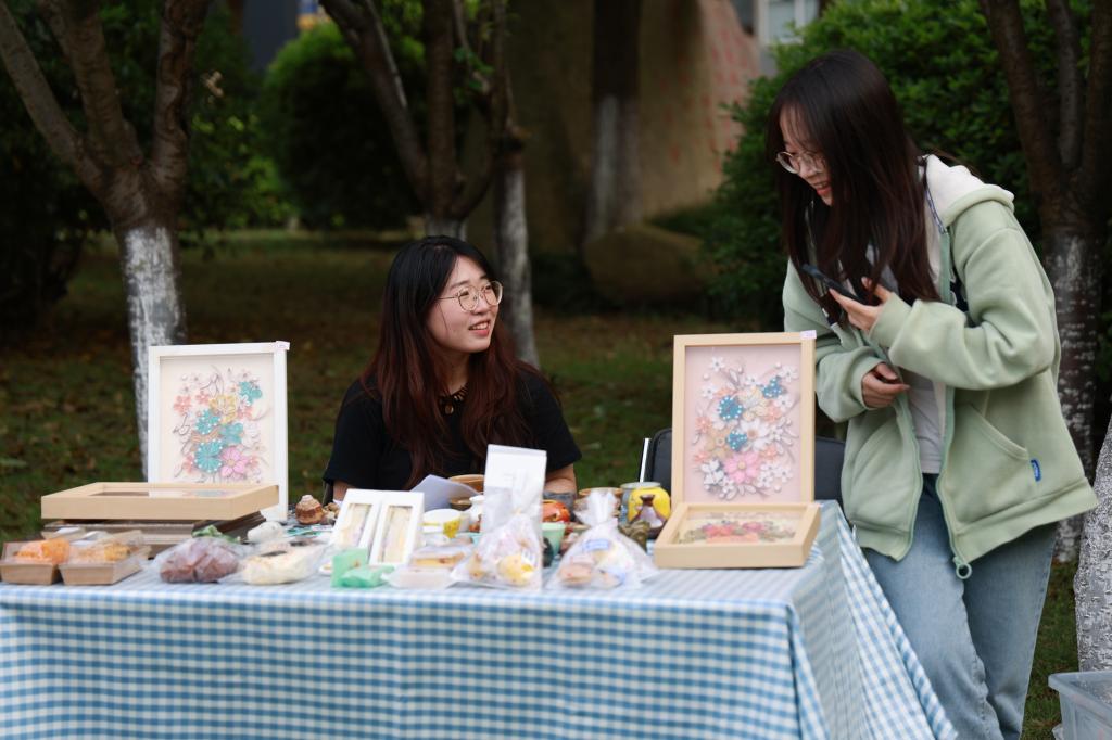 文创产品创作是让中国优秀传统文化“活”起来的一种新颖形式,传法学子执笔设计,将自身的文化自信融入到一件件精美的产品之中。传媒与法文创义卖、河姆渡文化产品集市、微距--助残爱心义卖三个不同的主题的集市在竺园热闹开展,吸引了许多到场同学。其中,河姆渡集市从宁波当地的人类文明遗址中提取灵感,将五叶纹、双鸟朝阳纹、猪纹融入笔记本、明信片、水杯等产品设计之中,激发起更多同学的文化认同感;传媒与法文创产品则立足于传媒和法学的特色,以相机、天平等为元素,以专业特点赋能文创产品设计,同学们在游览的同时也增强了自己对专业的认识。
