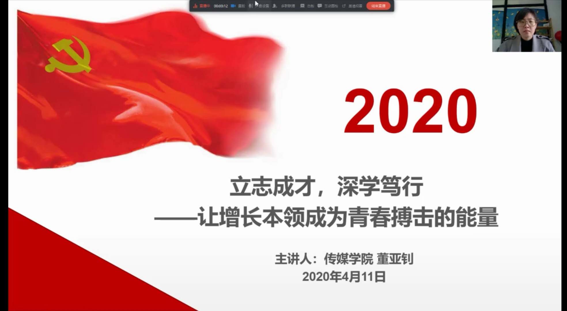 4月11日15:00,学生新闻党支部以钉钉直播的形式组织了两场主题党课,分别是支部书记董亚钊老师的《立志成才,深学笃行——让增长本领成为青春搏击的能量》、副书记曲昊杨老师的《将个人奋斗与中国梦紧密结合起来》,支部全体学生党员、积极分子以及2019级新闻学专业学生近200人参加。