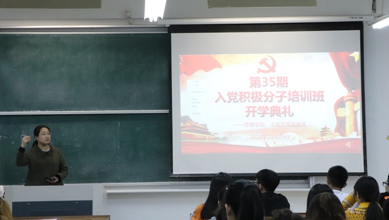 10月29日晚,党校第三十五期入党积极分子培训班传媒、法政、成教教学班传在SB212教室开班。参加本次开班仪式的有传媒学院党总支副书记朱小红老师、法政学院业务主管兼学生法学支部书记顾琼莹老师、本次培训班班主任兼学生设计支部书记赵红老师,以及第三十五期入党积极分子培训班学员。开班仪式由顾琼莹老师主持。