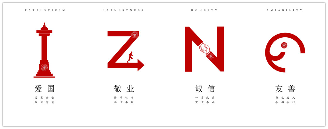 在这组设计中,“爱国”以纪念碑为元素,“敬业”以奔跑为元素,“诚信”以握手为元素,“友善”以笑脸为元素,“自由”以翅膀为元素,“平等”以对称为元素, “公正”以尺子为元素,“法治”以天平为元素, “富强”以火箭为元素,“民主”以投票箱为元素,“文明”以中国结为元素,“和谐”以自然为元素,表达了支部党员对社会主义核心价值观的用心理解以及爱党爱国、感恩学校的朴素情感。