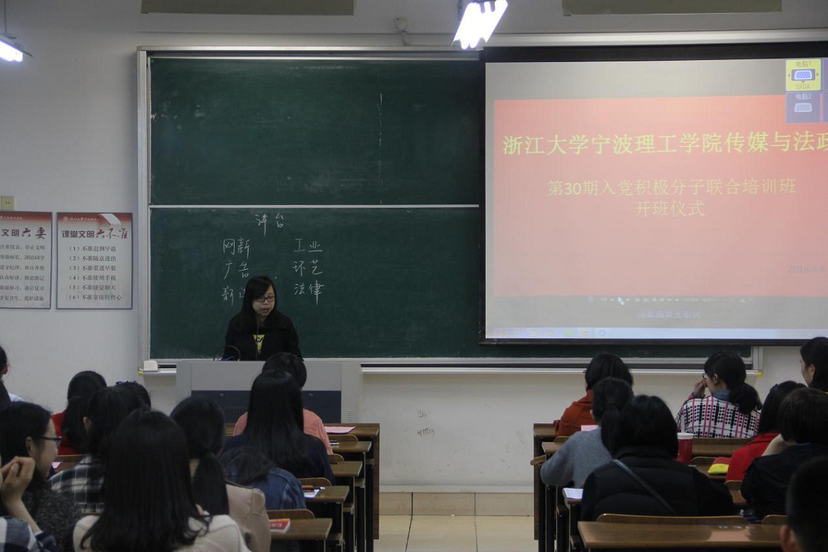 浙江大学宁波理工学院第30期入党积极分子传媒与法政学院联合培训班开班仪式暨第一讲于2016年4月6日下午6时20分在SB212教室正式举行。传媒学院党总支副书记朱小红老师、法政学院主管顾琼莹老师、传媒学工办盛芳、赵红老师等出席了开班仪式。
