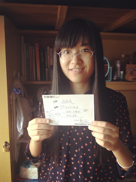 原来,这是他担任新生“宿舍导师”联系的广告122班夏兰叶同学的报喜电话。在本学期开学初,广告支部开展了“宿舍导师帮你为梦想打勾”的活动,每位大一学生都收到了一张卡片,担任“宿舍导师”的党员们让他们在卡片上面写下各自的阶段目标,并积极鼓励督促他们去实现目标。