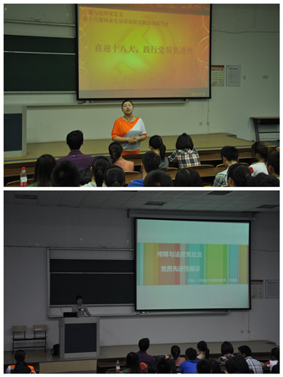 为体现党员的先进性,传媒与法律党总支于5月8日晚上6时30分在SB102举办以“喜迎十八大,践行党员先进性”为主题的第十八期预备党员培训班实践活动报告会。