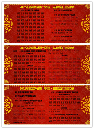 第三部分就是重头戏《2012年传媒与设计学院、法律系红墙名单》。最为引人注目的是2011年国家奖学金获得者,他们分别是法学081班的林汇铭和新闻082班的周元男。宁波市学生励志标兵由广告101班的马金娇获得。再下面则是单项奖学金获得者的名单,包括了学习优秀奖学金、社会工作优秀奖学金、美育优秀奖学金等多项奖学金。校十佳学生由法学081班的徐露佳获得;优秀学生干部由王鸿娇、高女等人获得。随后还有先进班级、文明寝室等团体项目的表彰名单。最大的板块是优秀学生奖学金与三好学生名单,优秀学生奖学金由曹伊慧、干露等人获得;而三好学生称号则由由王啸、刘笑笑等人获得。